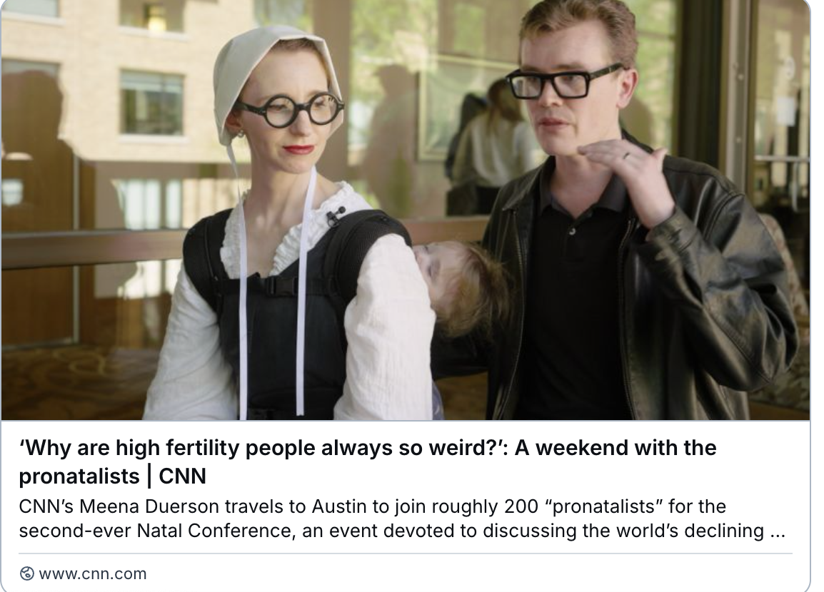 To me, what's never been particularly digestible about Natalism has been its disregard for the children that don't belong to the natalists themselves. There are gestures to food aid, education and healthcare, but nothing really comes close to fulfilling what they need. In cases where it is politically inconvenient for the Global North to empathize with child welfare such as Palestine's child death and malnutrition crisis, the silence stands out even more. Even domestically, natalist logic has allowed anti-child policy to skate by, including cuts to school lunch reimbursement, libraries and parks funding.