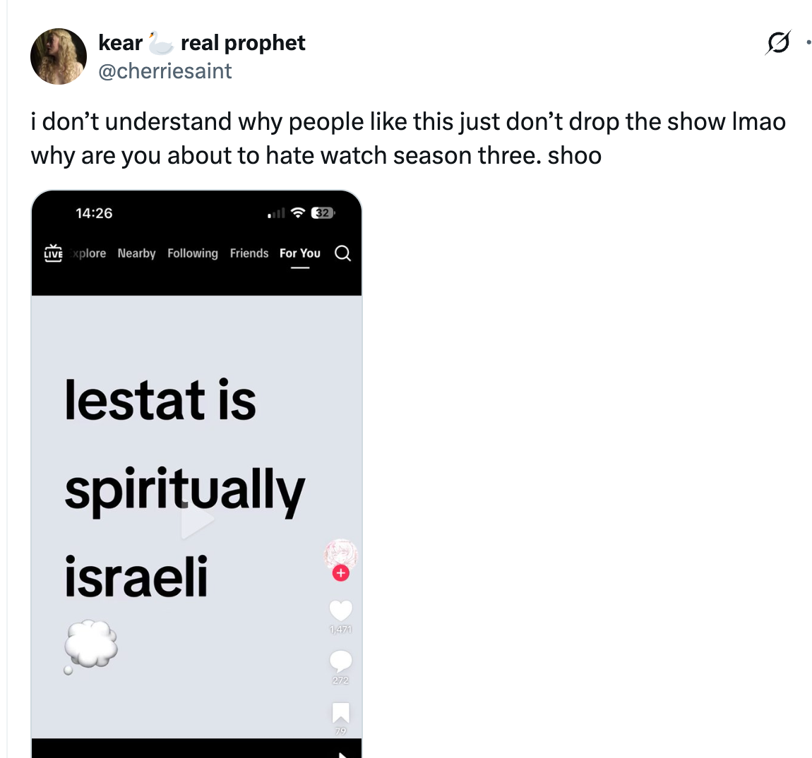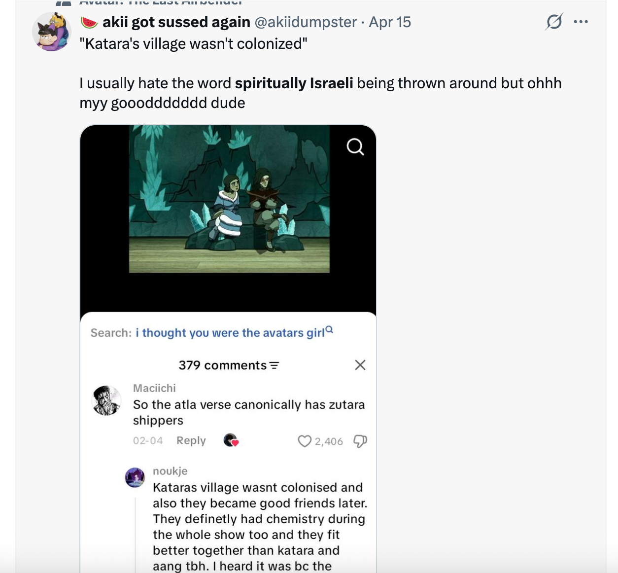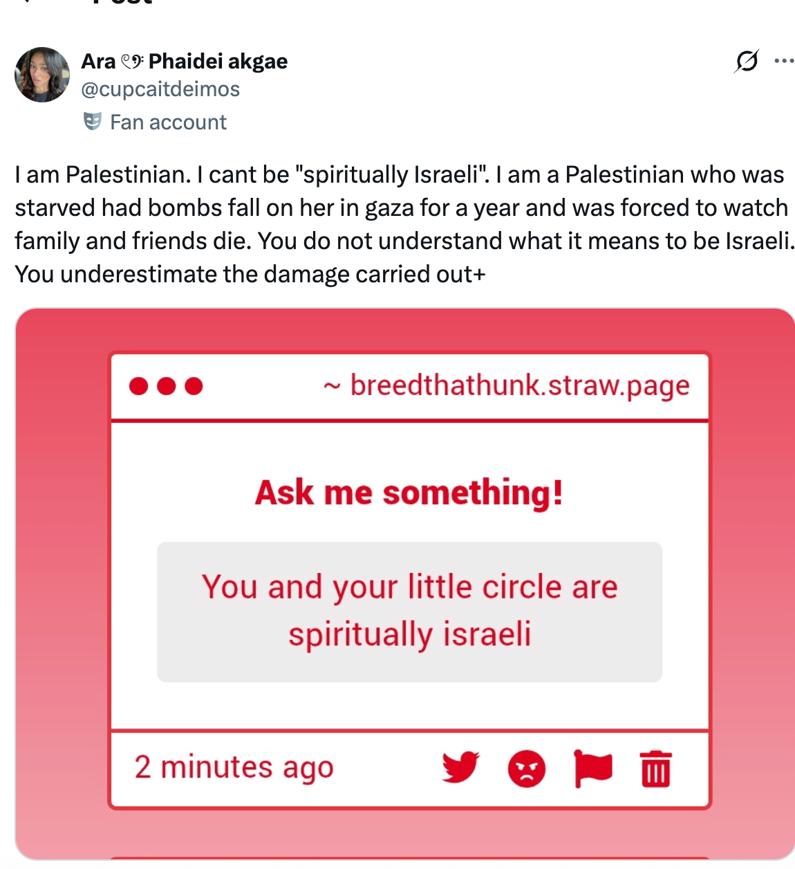 The term "spiritually Israeli" (and using "Zionist" to describe people and concepts outside of "believes in Jewish supremacy in Israel and no guaranteed rights for non-Jews" ) reveals this creative bankruptcy among fandoms. They could use other phrases or terms to describe colonial behavior, privilege or bigotry. But "Israeli" has become more than the concrete nation-state taking violent action. This troubling evolution is particularly dire as Palestinians have struggled to retain attention, sympathy and solidarity. In real time, more and more of them are starving, lacking medical treatment access and being subject to the horrors of abrupt and unprompted attacks. It is a reality that should not be forgotten or undermined, particularly if those commenting on "Zionist" or "spiritually Israeli" celebrities aren't victims of Israel's real attacks. At best, the subjects of Stans' ire or adoration are several degrees removed from the political decisions allowing the genocide to continue.